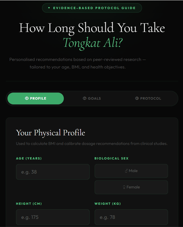 You can now estimate the amount and duration of your Tongkat Ali daily consumption using our personalized evidence-based protocol below.