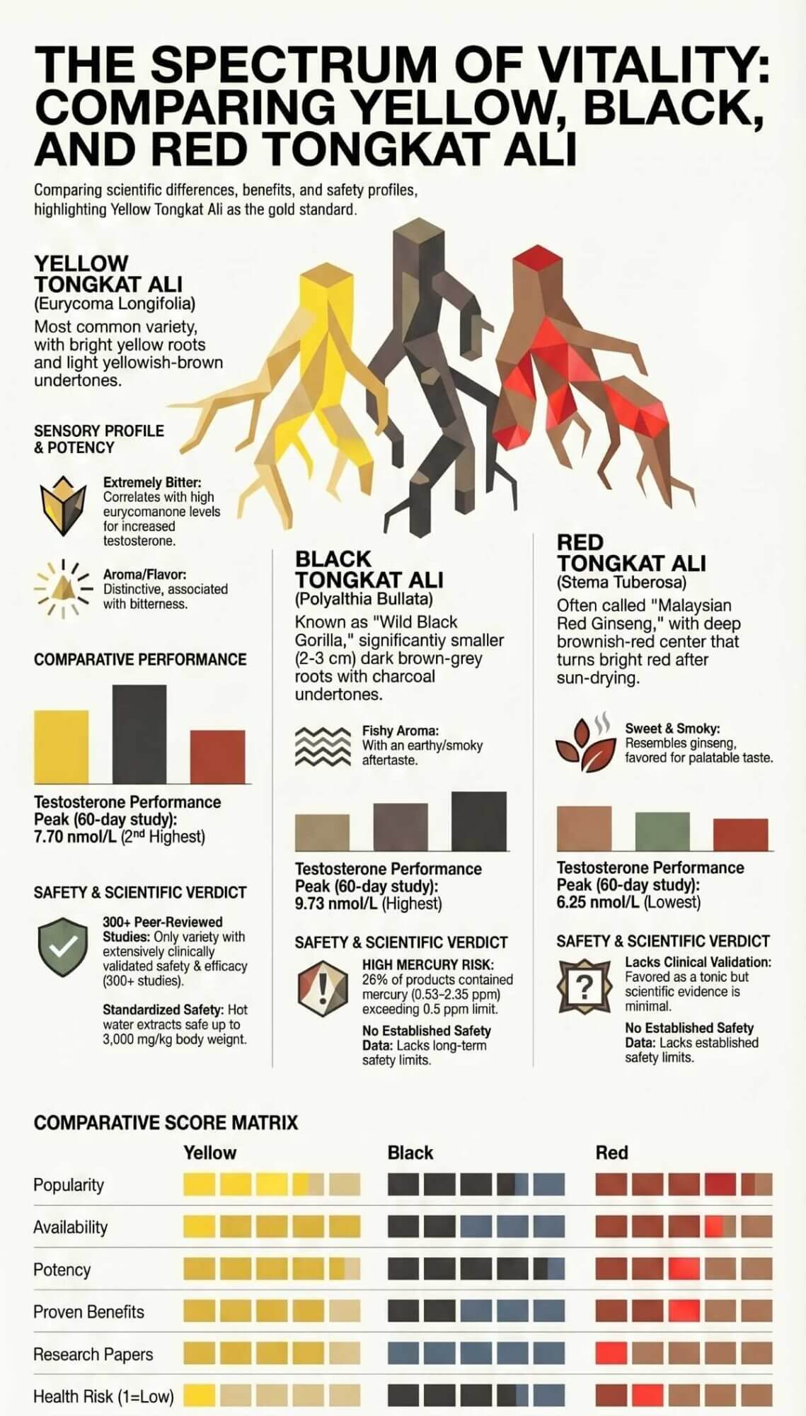 We compare head-to-head to determine the best type of Tongkat Ali based on six criteria. This is based on a score of 1-5 (Low to Very High).